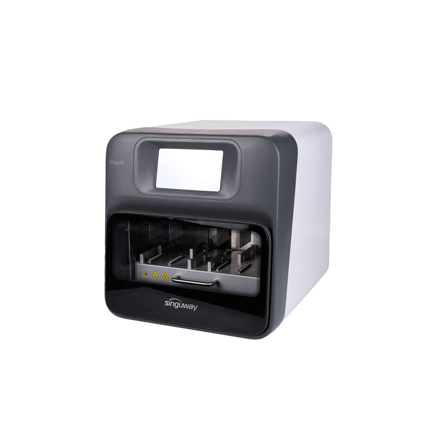 Singu48系列核酸提取仪是一种体外诊断设备,与配套试剂一起使用,从样本中提取、纯化核酸,供下游进行核酸检测。