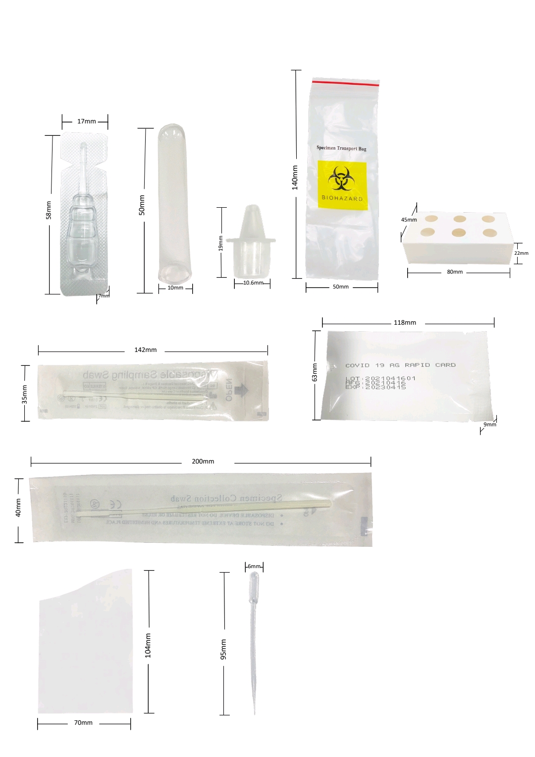 Test Card×1; Diluent: 0.3mL×1 Tube/Kit; Sample Tube with Filter Cap×1; Sterile Swab×1; Biosafety Bag×1 |